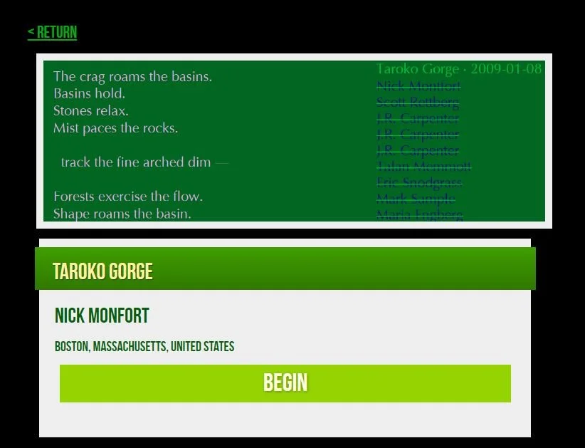 Nick Montfort's naturistic poetry generator Taroko Gorge has inspired dozens of 'remixes' since it was first published – the relatively accessible code structure invites others to tinker with it and transform its context. I came to this poem somewhat late, after I had first started making generative poems like futurity blues with the software library Tracery. It was immediately obvious though that this was basically the blueprint for all of the writers and artists I was admiring and attempting to emulate at the time (the placement of a missing puzzle piece for my creative practice!)